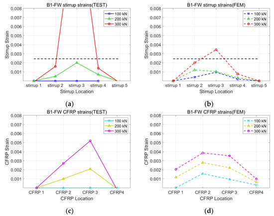 Strains of B1-FW specimen: (a) stirrup of test; (b) stirrup of FEM; (c) CFRP of test; (d) CFRP of FEM.