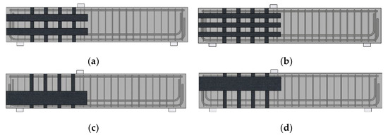 Horizontal CFRP layout patterns: (a) distributed CFRP layout with two strips (100 mm); (b) distributed CFRP layout with three strips (70 mm); (c) on strip (200 mm) at bottom half; (d) one strip (200 mm) at the upper half.