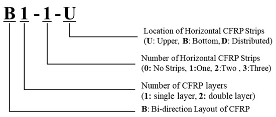 The study focused on numerical modeling which can describe the mechanism of bidirectional CFRP strips. The experiment tested the specimens with bidirectional CFRP layouts under different CFRP configurations. Additionally, the experiment included specimens with unidirectional CFRP strips under the same configurations. The specimens used in this study were the same as the test specimens used by Haroon et al. [39]. The main variables of this study included CFRP layouts, number of CFRP layers, and wrapping configurations of CFRP strips. Figure 1 describes the nomenclature of the specimen in the experiment program. The first character represents the layout of the CFRP strip. The second character indicates the number of CFRP layers used, which was either 1 or 2. The third character describes the wrapping configuration of the CFRP.