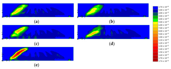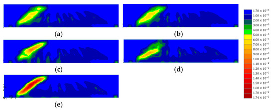 Figure 14 presents the distribution of concrete strains for the test specimens of different layouts. Control in the figure indicates the numerical model of the concrete beam strengthened with only vertical CFRP strips (no horizontal CFRP). In the figure, the high strain values of all specimens are concentrated around the diagonal crack between the left support and the left loading point. As expected, the control showed the highest strain values (0.0173) compared to the other cases. For B1-1-B and B1-1-U, the highest strains, of 0.009, were found at the upper half and the lower half of the beams, respectively. These were where the horizontal strips were not placed. Among the models with distributed horizontal CFRP strips, B1-3-D showed the lowest strain, 0.006, and the most evenly distributed results. The next lowest strain value was seen in B1-2-D (0.007). In the model, high strains were found between horizontal strips. These results indicate that the continuing effect of horizontal CFRP strips can be maximized when the strips are divided and placed widely along the depth of the concrete beam. If a wide strip is horizontally bonded aside due to the site condition, the other part without the horizontal strip is the weak point. For the effective strengthening of RC beams, horizontal strips must be bonded uniformly along the depth of the beam.