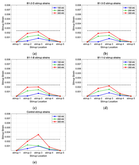 Figure 15 presents the stirrup strains for different CFRP layouts. The distribution of stirrup strains was examined to verify the continuing effect caused by the horizontal CFRP strengthening. The maximum strain value for the B1-2-D, B1-3D, B1-1-B, B1-1-U, and control models were 0.00219, 0.00207, 0.00201, 0.00223, and 0.00345, respectively. From the figure, it can be seen that models with horizontal CFRP presented similar stirrup strain distributions regardless of layout (highest strain at the top and higher stirrup 2 strain than stirrup 4 strain at 300 kN). Stirrup strains of all models with horizontal CFRP showed lower strain values than those of the control at all loads. Furthermore, the stirrups of models with horizontal CFRP did not yield when the loading reached 300 kN, while the stirrup of the control showed a strain value higher than the yielding strain (0.00244).