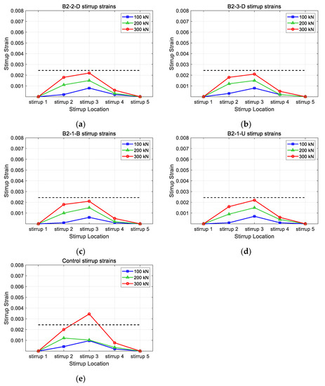 Comparison of stirrup strains for different horizontal CFRP layouts: (a) B2-2-D; (b) B2-3-D; (c) B2-1-B; (d) B2-1-U; (e) control.