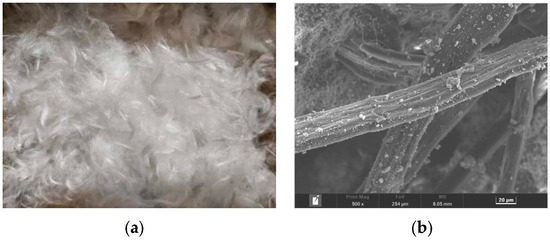 The raw materials prepared for casting specimens included PII 52.5 Portland cement, Class fly ash, fine sand, and polycarboxylic high-range water reducer (HRWR). The chemical compositions of the cement and fly ash, measured by XRF (X-ray fluorescence spectroscopy), are shown in Table 1. The fine sand was ultra-fine sand produced by Shanghai Fengxian Sand Factory, with specifications of 70~110 mesh and a maximum particle size of 0.21 mm. The water reducing agent was the high efficiency powder water reducing agent of polycarboxylic acid, produced by Shanghai Sanrui Company. Ultrahigh molecular weight polyethylene cropped fibers (PE) was selected as the reinforcement. The appearance and microscopic morphology of the PE fibers are shown in Figure 1a,b, the fibers have a disordered distribution. The fiber length was 12 mm, fiber diameter was 25 μm, and the density and elastic modulus of the fiber were 0.97 g/cm3 and 116 GPa, respectively. The volume fraction of PE fibers in the mix was 1.5%.