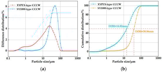 Particle size distribution of the XYPEX-type and SY1000-type CCCWs: (a) Difference particle size distributions; (b) Cumulative particle size distributions.