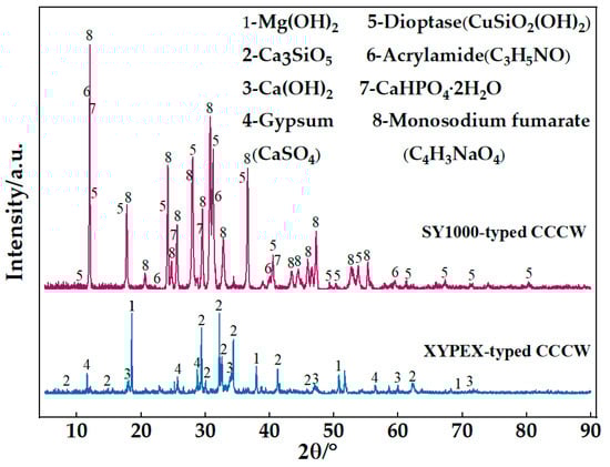 After 28 days of curing, X-ray diffraction analysis (D8, Advance, Bruker) was performed to identify the chemical compositions of the two different kinds of CCCWs, the phase composition (Figure 3).