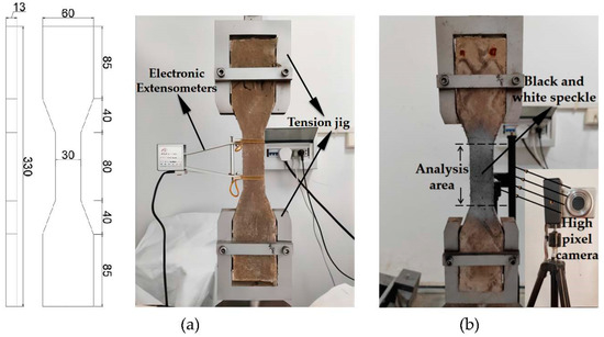 (a) Dog-bone specimen dimensions and test device; (b) DIC test.