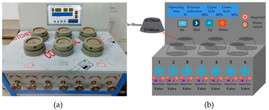 The permeability test was performed using the permeability height method, via an SS-15 mortar permeability meter, test equipment, and the specific specimen size, as shown in Figure 5a,b. After the test began, the water pressure was maintained at a constant (1.2 ± 0.05) MPa and maintained for 24 h. At the end of the test the specimens were split into two halves, using a waterproof pen to trace the watermarks and a steel ruler along the watermarks at equal intervals to measure 10 measuring points. Finally, the average value was used as the water penetration height of the group of specimens.