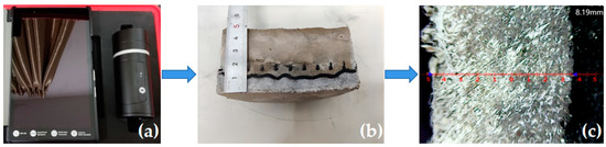 The chloride ion penetration test was performed based on the rapid chloride-ion migration coefficient method (RCM) stipulated in GB/T50082-2009 [49]. The diameter and height of the cylinder specimens were 100 mm and 50 mm, respectively. Before the test, a water saturation machine was used to vacuum water the specimens for (18 ± 2) h. Approximately 300 mL of NaOH solution, with a concentration of 0.3 mol/L, was injected into the rubber sleeve, and 12 L of NaCl solution, with a mass concentration of 10%, was injected into the cathode test tank and made flush with the liquid level of the NaOH solution in the rubber sleeve, as shown in the test diagram and schematic diagram in Figure 6a,b. After the experiment, the cylinders were cut into halves along the diameter and then sprayed with 0.1 mol/l AgNO3 solutions onto the cut sections. After that, the penetration depth of chloride ions was measured by using a KS-105 wireless electronic meter, as shown in Figure 7a–c.
