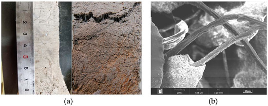 As shown in Figure 9a, under uniaxial tension, the PE-ECC showed excellent crack control ability. Different from the brittle failure that occurred in ordinary concrete, the failure modes of PE-ECC were ductile failures, extending from one single crack to multiple fine cracks. All the PE-ECCs demonstrated tensile strain-hardening behaviors under tension, indicating that PE-ECC can still bear a higher load with a continuous increase in strain. Additionally, the cracking at the first crack point gradually developed into multiple cracking in the whole range. The microscopic morphology of the matrix material and PE fibers following tensile damage is shown in Figure 9b, where the PE fibers are pulled out instead of being pulled off. These properties of PE fibers favor defect size tolerance and fiber bridging complementary energy. This indicates that the PE fibers can withstand greater deformation and that the material ductility was significantly enhanced.