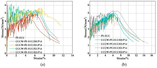 Stress-strain curves of (a) CCCW-PE-ECC(X) and (b) CCCW-PE-ECC(S).