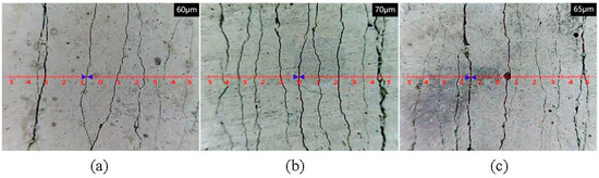 Crack distribution after stretching of (a) PE-ECC, (b) CCCW-PE-ECC (X1.0%), and (c) CCCW-PE-ECC (S1.0%).