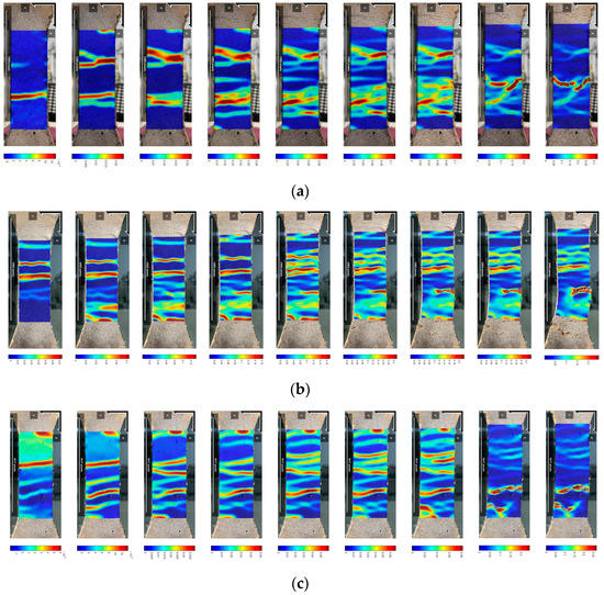 Strain clouds of (a) PE-ECC, (b) CCCW-PE-ECC(X1.0%) and (c) CCCW-PE-ECC(S1.0%).