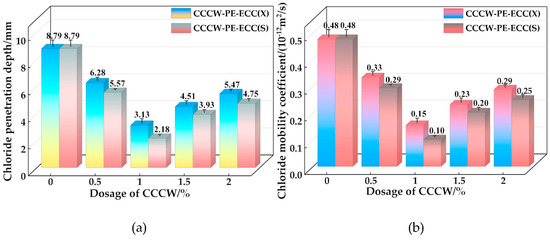 The chloride ion permeation heights and chloride ion diffusion coefficients of CCCW-PE-ECC(X) and CCCW-PE-ECC(S) are shown in Figure 15a,b, respectively. With increasing CCCW doping, the chloride ion permeation heights of CCCW-PE-ECC(X) and CCCW-PE-ECC(S) show a decreasing and then increasing trend, and the chloride ion permeation heights of CCCW-PE-ECC(X1.0%) and CCCW-PE-ECC(S1.0%) show minimum chloride ion permeation heights of 3.13 mm and 2.18 mm, respectively, which are 64.39% and 75.20% lower than the baseline group. The chloride ion diffusion coefficients shows a decreasing and then increasing trend, and CCCW-PE-ECC(X1.0%) and CCCW-PE-ECC(S1.0%) exhibit the smallest values, 0.15 × 10−12 m2/s and 0.10 × 10−12 m2/s, respectively, which are 68.75% and 79.17% lower than those of the reference group.