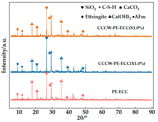 XRD patterns of PE-ECC, CCCW-PE-ECC (X1.0%), and CCCW-PE-ECC (S1.0%).