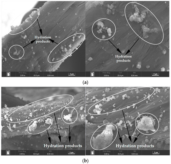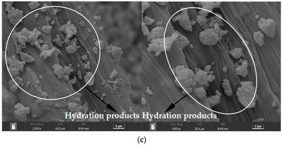 The microscopic topographies of PE-ECC, CCCW-PE-ECC(X1.0%) and CCCW-PE-ECC(S1.0%) after chloride ion penetration are presented in Figure 18a–c, respectively. THe XRD results showed that the hydration products may be CaCO3, C-S-H, and AFT on the fiber surface. The amount and volume of hydration products on the surface of the PE-ECC fibers were decreased compared with CCCW-PE-ECC(X1.0%) and CCCW-PE-ECC(S1.0%). Hydration products on a fiber’s surface not only promote the connection between the fiber and the matrix but also fill the pores. Due to the reduction of hydration products, the pores originally filled by hydration products will reappear, resulting in the decrease of matrix compactness and the degradation of PE-ECC performance to a certain extent. The hydration products of CCCW-PE-ECC(X1.0%) and CCCW-PE-ECC(S1.0%) are greater in number and more dense than those of the PE-ECC after chloride ion permeation, indicating that they are more resistant to chloride ion attack than PE-ECC, which further indicates that the incorporation of a CCCW can effectively improve the chloride ion permeation resistance of PE-ECC.