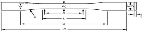 Tensile sample dimensions, where: W: 13 ±0.5 mm; L: 57 ±0.5 mm; WO: 19 ±6.4 mm; LO: 165 mm; G: 50 ± 0.25 mm; D: 115 ±5 mm; R: 76 ±1 mm; and T: 3.2 ±0.4 mm.