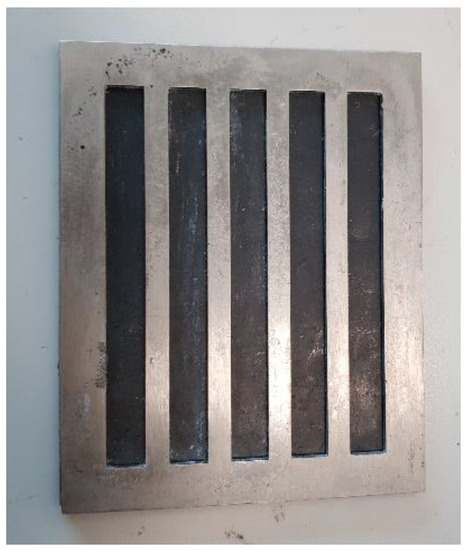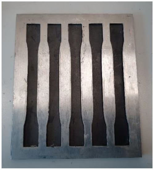 The tensile strength of the composites was determined for different samples fabricated according to the tensile test method standard ASTM D-3039 (Standard Test Method for Tensile Properties of Polymer Matrix Composite Materials). The tensile test was carried out at room temperature (23 ℃) and 50% humidity with a crosshead displacement of 2 mm/min using the MTS Universal Testing Machine (MTS system corporation, Eden Prairie, MN, USA) with a 50 kN load cell. The dimensions used are illustrated in Figure 6, and the mold in Figure 7.