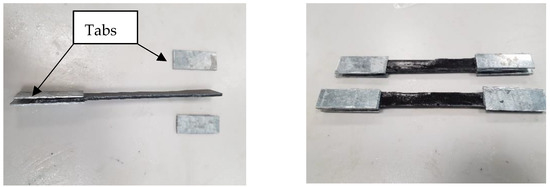 Due to the setup of the tensile machine, the thickness of the fabricated samples’ shoulders had to be altered to fit in the mechanical jaws and act as a stress absorber preventing crack initiations at the points of contact. As such, rectangular-shaped aluminum shoulder tabs of dimensions 50 mm × 20 mm × 2 mm were attached to the sample using adhesive, as shown in Figure 8.