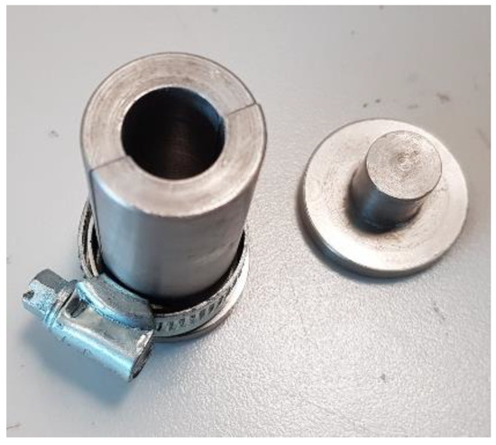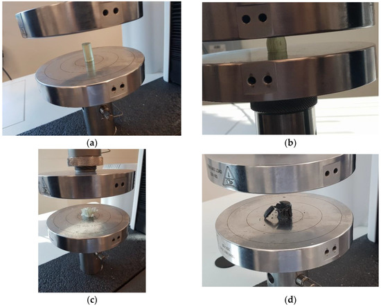 The compressive strength of the composites was determined for different samples fabricated according to the compression test method standard ASTM D695-15. The mold used is illustrated in Figure 9. The tests were carried out using the MTS Universal Testing Machine with a 50 kN load cell at a crosshead displacement of 5 mm/min, as shown in Figure 10.