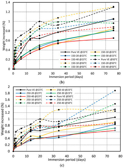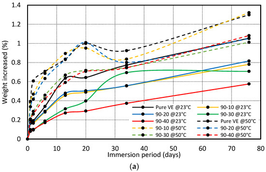 Figure 14 shows that the maximum water absorption was 1.05% and 1.3% for the pure vinyl ester composite at 23 °C and 50 °C after the immersion of 76 days. The amount of water absorbed was reduced with the addition of reinforcement. The weight increase rate was almost the same for the composite prepared with reinforcement sizes of 90 µm and 150 µm, as indicated in Figure 14a,b. The water absorption was high in the composite prepared with a fiber size of 250 µm compared to 90 µm and 150 µm. This could be due to the porosities and cavities developed in the composite during fabrication.