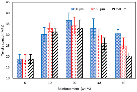 After the 20 wt% fraction, a downward trend was recorded of a value of 30.5 MPa for the 90 µm specimens while obtaining values of 24.8 MPa and 15.9 MPa for 150 µm and 250 µm, respectively, at the 40 wt% fraction. It is thought that the tensile strength reduction at higher reinforcement fractions is due to the non-uniform mixing between the powder/resin and the air entrapment (porosity) within the mixture [38,39,40]. In addition, this may be due to the decline in the net available short carbon fiber/vinyl ester interfacial area because of SCF accumulation or disputes in the dispersion of fiber bundles in the matrix [25]. This was also evident in the SEM images. With the increased fiber content, the decrease in strength could be attributed to the increased orientation randomness, where a similar trend was observed by Genna et al. [41].