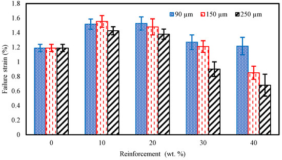 With the recycled composite tensile strain characteristics presented in Figure 16, it can be noted that a slight increase is obtained for the 90 µm samples up to the 20 wt% fraction with a respective value of 1.53%. A reduction followed this to 1.16% for the 40 wt% fraction which follows a similar trend as that of the tensile strength results in Figure 15. Regarding the 150 and 250 µm samples, the highest strain was recorded at a 10 wt% fraction and then decreased to 0.85% and 0.68%, respectively, at the 40 wt% fraction.