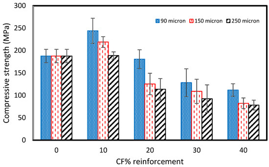 A compression test was performed at room temperature (RT) on the prepared samples using the Instron Universal Testing Machine with a 50 kN load cell at a crosshead displacement of 5 mm/min. The compressive strength of the pure vinyl ester composite was recorded to be 187.75 MPa. The addition of reinforcement results in the increase in the compressive strength for 10 wt% of reinforcement. However, it was reduced with the further addition of recycled carbon powder to the composite. Figure 17 shows that the compressive strength increased by 30% from 187.5 MPa to 244 MPa with 10 wt% of the recycled carbon powder composite of a 90µm particle size. Samples prepared with 150 µm and 250 µm fiber size show approximately 17% and 1% increases in the compression strength with the addition of 10 wt% of recycled carbon powder. The compressive strength was reduced to 111.94 MPa, 82.2 MPa, and 78.23 MPa with 40% rCF for 90, 150, and 250 µm particle sizes. This decrease in the compressive strength indicates that the material produced became progressively more resistant to deformation. The increase in modulus further confirmed the loss of elasticity, which reflects increased rigidity. There are potential reasons that can explain the drop in the compression properties, such as the agglomeration of the reinforcement, which is also reflected in the SEM images. This results in poor compatibility [42,43]. In addition, the formation of hydrogen bonds between the filler content may cause the agglomeration of rCF [44].