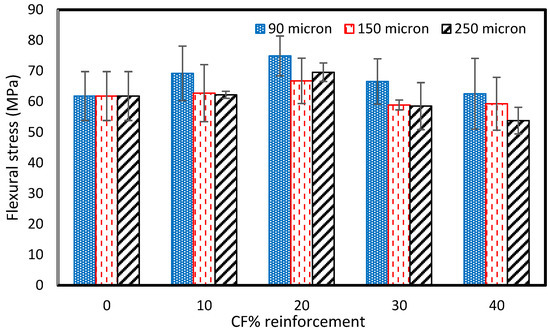For 90 µm size particles, the flexural strength increased by 12% with the addition of 10 wt% rCF. The highest increase in the flexural was observed with 20 wt% rCFC, about 74.9 MPa. The flexural strength was 66.6 MPa and 62.6 MPa with 30 and 40 wt% rCFC, respectively. For 150 µm and 250 µm rCFC size particles, the highest flexural strength was observed with 20 wt% rCFC, which was about 66.8MPa and 69.6MPa, respectively. However, the lowest flexural strength was 59.3 and 53.8 for 150 µm and 250 µm rCFC size particles, respectively, obtained at 40 wt% rCFC reinforcement.