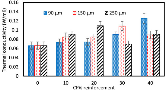 The thermal conductivity of the fabricated composite is shown in Figure 19. The thermal conductivity of the pure vinyl ester composite was 0.06615 W/mK. The thermal conductivity increased with the addition of reinforcement. It is due to the fact that the thermal conductivity of the carbon powder is higher than the pure vinyl ester resin. The thermal conductivity was 0.07387 W/mK, 0.8494 W/mK, and 0.09102 W/mK with 10 wt% for 90 µm, 150 µm, and 250 µm sizes of reinforcement, respectively, and was 0.0741 W/mK, 0.08494 W/mK, and 0.1094 W/mK for 20 wt% of reinforcement. With the further addition of the reinforcement, the thermal conductivity of the samples increased for 90 µm and reduced for 250 µm at 30 and 40 wt% of reinforcement. The maximum thermal conductivity value was 0.1254 for 90 µm with the addition of 40 wt% of reinforcement. The reduction in the thermal conductivity could be due to the voids developed due to the improper mixing during the fabrication of the samples [43]. A similar decrease in thermal conductivity with an increase in the weight percentage of the reinforcement was reported by Barkahd et al. [47].