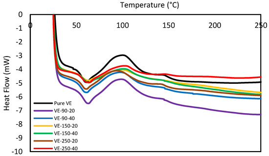 The DSC test was performed on the pure vinyl ester composite and recycled composite. Figure 20 presents the DSC curves for the samples prepared with reinforcement sizes of 90, 150, and 250 µm for the addition of 20 and 40 wt% of reinforcement. The DSC result shows that the pure vinyl ester composite sample’s glass transition temperature (Tg) was 52.92 °C. It was observed that the glass transition temperature was slightly increased with the addition of the reinforcement. However, the variation in the Tg of reinforced composing among themselves was very small. The Tg varied about 57 ± 1 °C for all combinations. For 20 wt%, the Tg was 56.9, 57.37, and 56.7 for 90, 150, and 250 µm, respectively. Furthermore, it was 57.857.9 and 56.6 for 90, 150, and 250 µm, respectively, for 40 wt% of the Tg.