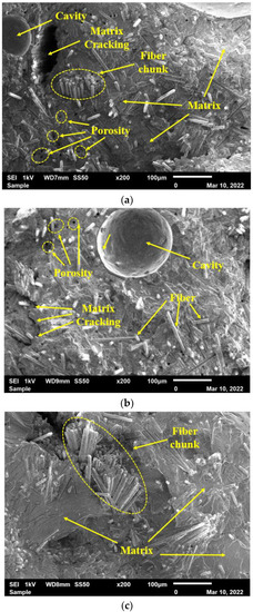 Figure 22 shows the effect of further addition of reinforcement in the composite. The non-uniform distribution of reinforcement is prominent on the surface of the composite. The cavity on the surface of the composite shown in Figure 22a,b is mainly due to the air trapped during the mixing of the reinforcement in the resin. Also, the chunk of fiber observed on the surface of the composite, as shown in Figure 22a,c, results in reduced homogeneity across the cross-sectional area of the sample. Furthermore, the carbon fibers’ conglomeration minimizes the filler content’s surface area in contact with the matrix, resulting in weaker adhesion. This non-uniform distribution results in unexpected variations in the tensile and flexural properties of the composite.