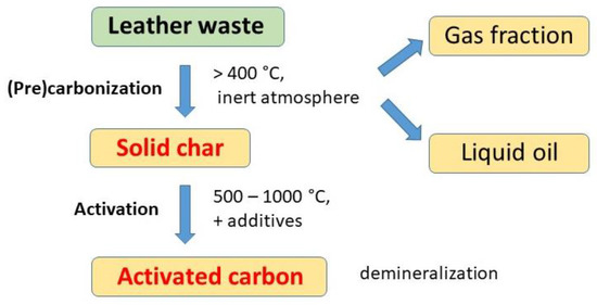 In simple carbonization, the crushed or powdered leather waste is heated at elevated temperatures in an inert nitrogen atmosphere to obtain a solid char (Figure 1). In some studies, the temperature is relatively low. Hydrothermal carbonization has been carried out in aqueous mediums at temperatures between 100–200 °C [16,17] and even temperatures below 200 °C produced materials with activity in the photocatalytic decomposition of water pollutants [15]. Higher temperatures, 400–500 °C, have been used more often [18] and the carbonizations have been usually carried out above 500 °C [19,20,21], up to 1000 °C [22]. Still, higher temperatures have not been used because of the low yields expected under such conditions.