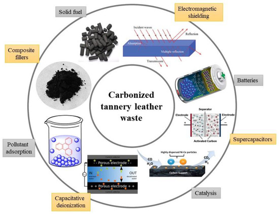 The application of carbonized leather waste proposed in the literature (Figure 4) is similar to the uses of other carbonized biomaterials. In contrast, however, some specific features can be exploited. These are represented by a fibrous microstructure, nitrogen content, the presence of chromium, and high electrical conductivity, as illustrated below.