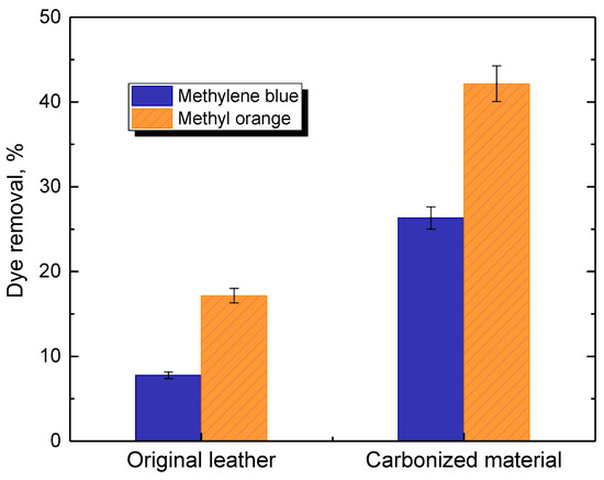 The biochar-based materials and their application in the removal of organic contaminants, viz. organic dyes, from aqueous media have been reviewed [86,87,88,89]. The ability of leather to adsorb cationic methylene blue and anionic methyl orange increases after carbonization (Figure 5). When the carbonized leather is used without subsequent treatment in aqueous media as an adsorbent, spontaneous demineralization may take place with an associated increase in the specific surface area [52] and consequent improvement in adsorption capacity. In the majority of cases, the activated carbons have been used for this purpose because the enhanced specific surface area is expected to increase the adsorption capacity.