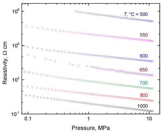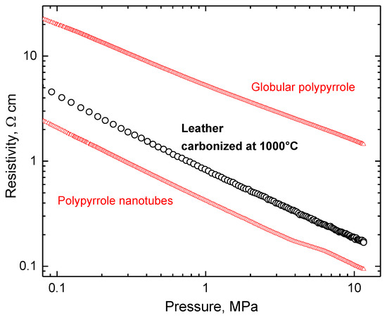 In this section, the preliminary electrical properties of leathers carbonized in the 500–1000 °C temperature range are reported to illustrate the preparation of carbonaceous materials with conductivity suitable for various applications. The determination of conductivity, or its reciprocal value, resistivity, meets some specific requirements. Chromium-tanned beige pigskin leather is used to simulate waste and carbonized at elevated temperatures in an inert atmosphere, and the products are ball-milled. The resulting powders cannot be compressed to a solid pellet needed for the routine four-probe resistivity measurement. For this reason, the samples are placed in a glass tube and defined pressure is applied with a glass piston that carries four platinum/rhodium point electrodes on its perimeter [75]. The measured resistivity (not to be confused with resistance!) decreases with increasing carbonization temperature (Figure 6) and is reduced for the individual samples with applied pressure and consequent compression. The dependences in a double-logarithmic presentation are practically linear in the 0.1–10 MPa pressure range. Similar trends have been obtained for the macroporous melamine sponges coated with a conducting polymer, polypyrrole [105]. The resistivity behaviour of leather carbonized at the highest temperature, 1000 °C, is even closer to the conducting polypyrrole powders, globular form or nanotubes, determined under the same experimental conditions (Figure 7).