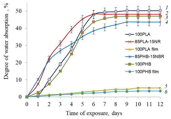 Water uptake of nonwoven fabrics: PLA (1), 90PLA/15NR (2), PHB (3), 90PHB/15NBR (4), and films: PLA (5) and PHB (6).