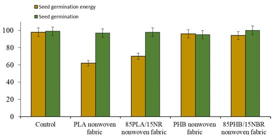 Then, an assessment of seed germination on PLA, PLA/NR and PHB, PHB/NBR nonwoven fabrics was carried out. There is a tendency to increase the germination energy of seeds and a noticeable increase in the parameters of the root system and seedlings of plants compared with the control substrate (Figure 4) [,].