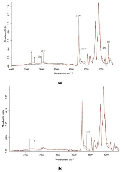The infrared spectra of the samples were recorded using a Lumos Bruker FTIR spectrometer (Bruker Corp., Bremen, Germany) at T = (23 ± 2) °C in transmitted light in the range of wave numbers 4000 ≤ ν ≤ 600 cm−1. For the mathematical processing of the data, the ACD labs software was used.