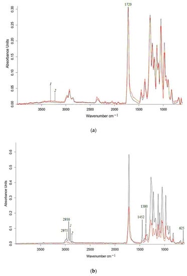 ATR-IR spectra of PHB (a) and 85PHB/15NBR (b) nonwoven fabrics (1) and 60 days after water (2).