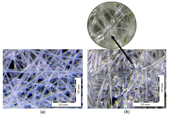 Optical micrographs of nonwoven samples: initial PLA (a) and PLA substrate (b).