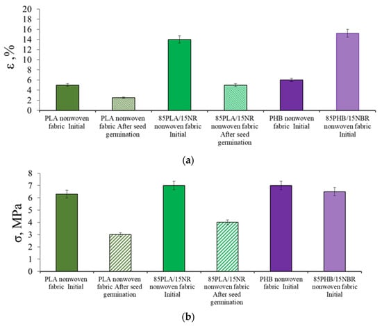 After the experiment with wheat germination for PHB and PHB/NBR agromaterials, it was not possible to determine the elongation at break and tensile strength values due to the destruction of nonwoven materials. PLA and PLA/NR composites were found to be more resistant to water and enzymes.