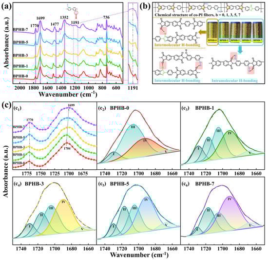 (a) ATR–FTIR spectra of the PI fibers with the different p-PDA/HAB/BIA molar ratios. (b) Intra-/intermolecular H-bonding interactions in BPHB fibers. (c1) Magnified ATR–FTIR spectra of PI fibers at the wavenumber range of 1800–1650 cm−1; (c2–c6) curve-fitting ATR–FTIR spectra in the wavenumber range from 1650 cm−1 to 1750 cm−1.