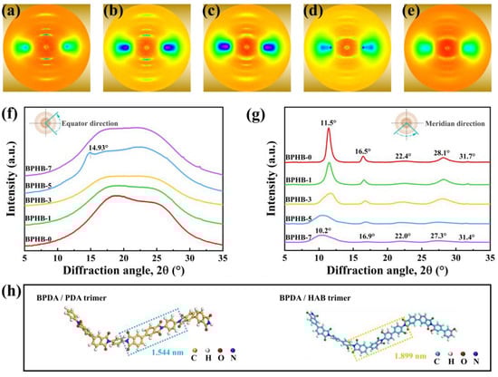 For the BPHB–0 fiber, five Bragg diffraction peaks at 2θ = 11.5°, 16.5°, 22.4°, 28.1°, and 31.7° can be identified in Figure 2g, revealing the highly oriented structure along the meridian direction. Moreover, the calculated d-spacing value for 2θ = 11.5° is 0.769 nm, which is close to one-half of the repeat unit length on the BPDA/p-PDA trimer (1.544 nm) at the minimum energy conformation (Figure 2h). Therefore, the diffraction peaks at 11.5° are ascribed to the (002) plane. Accordingly, the diffraction streaks at 2θ = 16.5°, 22.4°, 28.1°, and 31.7° can be attributed to the (003), (004), (005), and (006) planes. Similarly, the peaks at 2θ = 10.2°, 16.9°, 22.0°, 27.3°, and 31.4° for the BPHB–7 fiber are assigned to the (002), (003), (004), (005), and (006) planes, respectively, because the repeat length of the BPDA/HAB trimer (Figure 2h) is 1.899 nm. Obviously, the diffraction angle of the (002) plane gradually decreases from 11.5° (BPHB–0) to 10.2° (BPHB–7) with the increase in d-spacing (Table 3), implying that some BPDA/p-PDA units are replaced by larger BPDA/HAB units [25].
