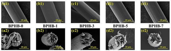 Furthermore, SEM technology was applied to investigate the interface failure modes of ILSS test samples (Figure 7d1–d5). As shown in Figure 7d1, the overall appearance of the fiber in unidirectional composites is relatively intact, which indicates that the failure form comprises the destruction of resin matrix originating from the poor interfacial load transfer effect caused by the weak bonding strength between the fiber and resin. When the HAB content in fiber is 10 mol % and 30 mol %, the surface of reinforced fibers exhibits an increasing fibril phenomenon, as in Figure 7d2–d3, reflecting that interfacial debonding present in the failure mode, i.e., the fibers gradually play a role of bearing the load during the process of material failure. After the content reaches 50 mol %, interfacial debonding has become the main failure mode, i.e., the reinforcement displays its reinforcing and toughening effects, which can be seen from the denser fibril structure and the adhesive bulk resin matrix on the fiber surface in Figure 7d4–d5. Consequently, with the increase in HAB in BPHB fibers, the interface failure mode of unidirectional PI/EPs gradually changes from the matrix failure mode to the reinforcement failure mode. This interface enhancement rule is more intuitively verified in the interface failure morphologies of the IFSS test samples (Figure 7e1–e5).