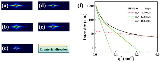 Depending on the analysis results of the cross-sectional morphologies of BPHB fibers, it is necessary to investigate the evolution of internal defects in the fibers after the introduction of HAB. Normally, due to the intense substance exchange during the coagulation and thermal-imidization processes in the wet-spinning method [38], some porous structures are inevitably produced in the final PI fibers and further influence their mechanical properties. These microvoids can be evaluated by using the 2D SAXS technique [37]. As shown in Figure 4a–e, the 2D SAXS patterns of BPHB fibers present a sharp and needle-shaped scattering streak along the equatorial direction, indicating that these microvoids are orderly aligned parallel to the fiber axis.