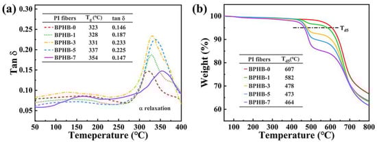 Figure 5a illustrates the DMA curves with the temperature ranging from 50 to 400 °C. The glass transition temperatures (Tg) of BPHB fibers are gradually enhanced from 323 °C for the BPHB–0 fiber to 354 °C for the BPHB–7 fiber, which follows the increased H-bonding imides after the addition of more HAB. In addition, it should be noted that the segmental motion must correspond to the intensity of the α relaxation peak (i.e., the value of tan δ), and the lateral packing order of macromolecules in BPHB fibers also significantly affect the segmental motion ability [23], as indicated based on the 1D WAXD in Table 3. Consequently, the tan δ values of PI fibers show an increasing–decreasing tendency.