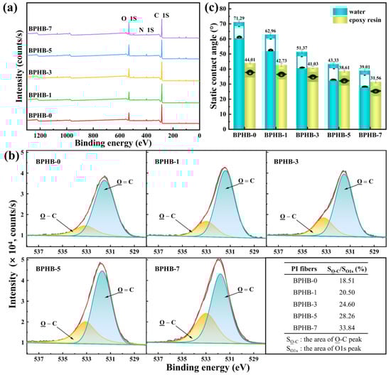 The XPS and static contact angle characterizations were utilized to quantitatively analyze the surface activity of BPHB fibers. Figure 6a shows the XPS comparison of these fibers, and the binding energy at 285.08, 400.00, and 532.08 eV is distributed to C1s, N1s, and O1s, respectively. Further, the surface element contents of the corresponding fibers were also accurately measured, as listed in Supplementary Table S1, and the O/C value significantly advances from 0.19 for the BPHB–0 fiber to 0.30 for the BPHB–7 fiber. Furthermore, curve-fitting O1s high-resolution spectra were determined using XPSPEAK software. In Figure 6b, the binding energy at 533.08 and 531.78 eV are identified as O-C and O=C, respectively [19], and then, the ratio of the area for the O-C peak to the area for the O1s peak is defined as SO-C/SO1s. For the BPHB–0 fiber, the SO-C/SO1s value was calculated to be 18.51%, which originated from the intermolecular chemical links, as revealed in Figure 1c. After the introduction of HAB, the SO-C/SO1s values of BPHB–1, 3, 5, and 7 fibers are 20.50%, 24.60%, 28.26%, and 33.84%, respectively, which is mainly due to the increase in the Ar-OH content compared to that in the BPHB–0 fiber. Hence, this phenomenon confirms that BPHB fibers with different surface activities were successfully produced.