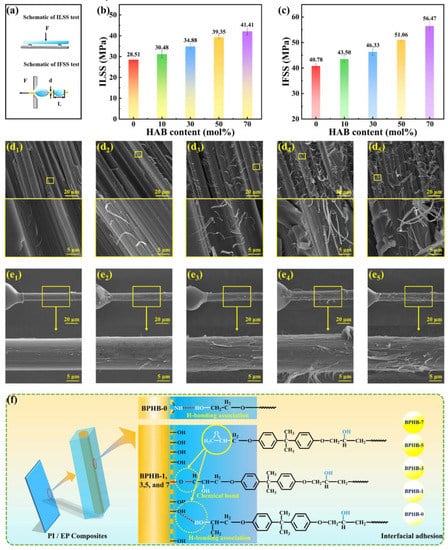 The influence of HAB contents on the interface properties of unidirectional PI/EPs were quantitatively evaluated by using ILSS and IFSS tests, as in Figure 7a. In detail, the ILSS and IFSS for the PI fiber without the HAB moiety are merely 28.51 and 40.78 MPa, as shown in Figure 7b–c, and then increase to 41.41 and 56.47 MPa with the HAB content of 70 mol %, respectively. Compared with the content of 0 mol %, the ILSS and IFSS for the BPHB–7 fiber increase by 45.25% and 38.47%, in which the IFSS value is already higher than that of plasma-modified PI fibers listed in Table 4. Moreover, the values for the BPHB–3 fiber increased by 22.34% and 13.61% as well.