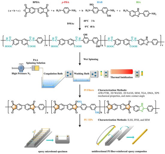 Unidirectional PI/EPs with the 55% volume fraction of reinforced fibers were fabricated using hand lay-up followed by compression molding [30]. The length of PI fibers used in the manufacturing of composites was first calculated, and then, these fixed-length fibers were arranged in parallel on a customized metal framework under pre-tension conditions. After being sufficiently impregnated in the uncured epoxy matrix with an E-51/PA651 mass ratio of 100/50, the impregnated fibers were delivered into a mold coated with the release agent and further cured at 60 °C for 1 h and 200 °C for 1 h under 0.2 MPa pressure. Subsequently, the unidirectional composites were taken out from the mold, cooled to room temperature, and cut into specimens with a width of 6 mm along with a thickness of 2 mm, suitable for the interlaminar shear strength test. In addition, the epoxy micro-bonded samples for the monofilament pull-out test were produced through a point-coating approach [18], in which the ingredient and curing procedure of epoxy were the same as those of PI/EPs. Scheme 1 concisely illustrates the preparation process of these two materials.