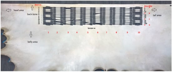Half skin parchment sample after mechanical tests samples withdraw, with indication of sampling areas (head, backbone, belly, and tail), batches number (left column numbers), sample number (horizontal line numbers), and irradiation doses (right column numbers; in the case of control samples, the batches A, B, C, and D are highlighted also).